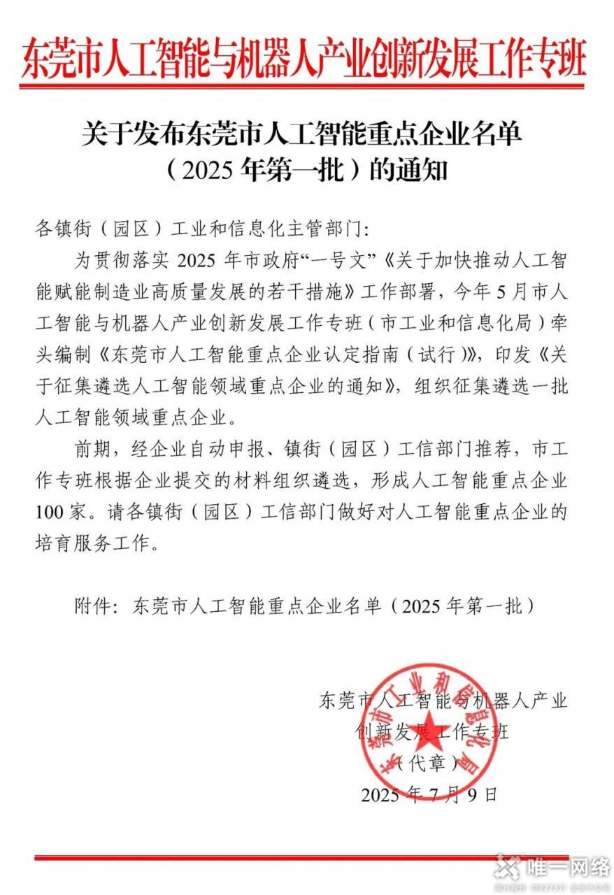 近日,東莞市人工智能與機(jī)器人產(chǎn)業(yè)創(chuàng)新發(fā)展工作專班正式發(fā)布《東莞市人工智能重點企業(yè)名單(2025 年第一批)》,唯一網(wǎng)絡(luò)憑借在人工智能領(lǐng)域的戰(zhàn)略布局、技術(shù)積淀與產(chǎn)